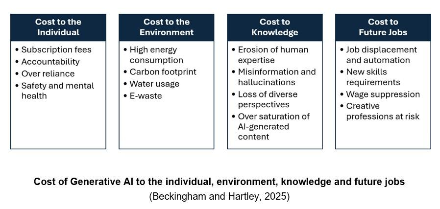 Critical AI literacy involves understanding how to use GenAI responsibly and ethically – knowing when and when not to use it, and the reasons why. The costs of GenAI are a critical component of this literacy. For example: